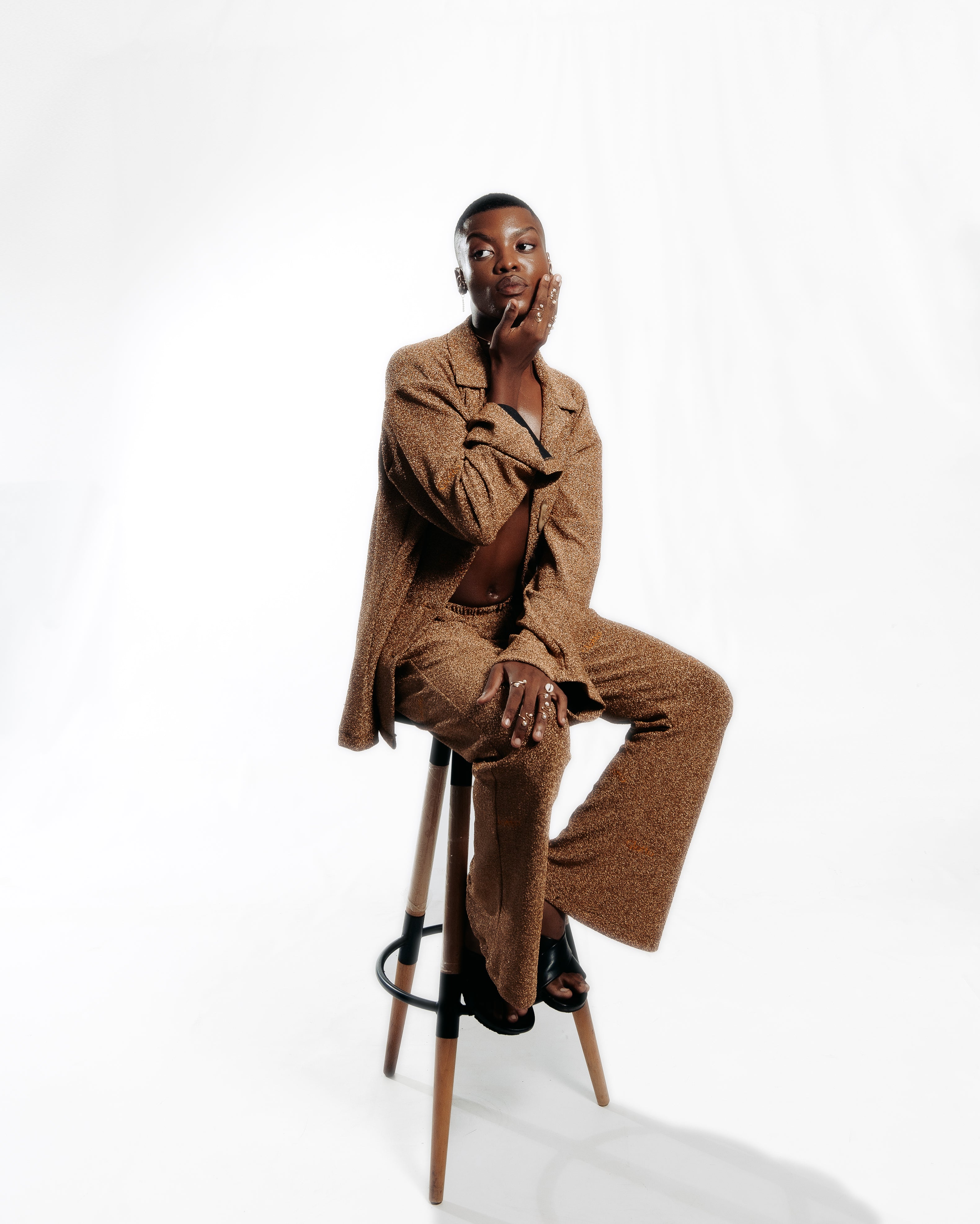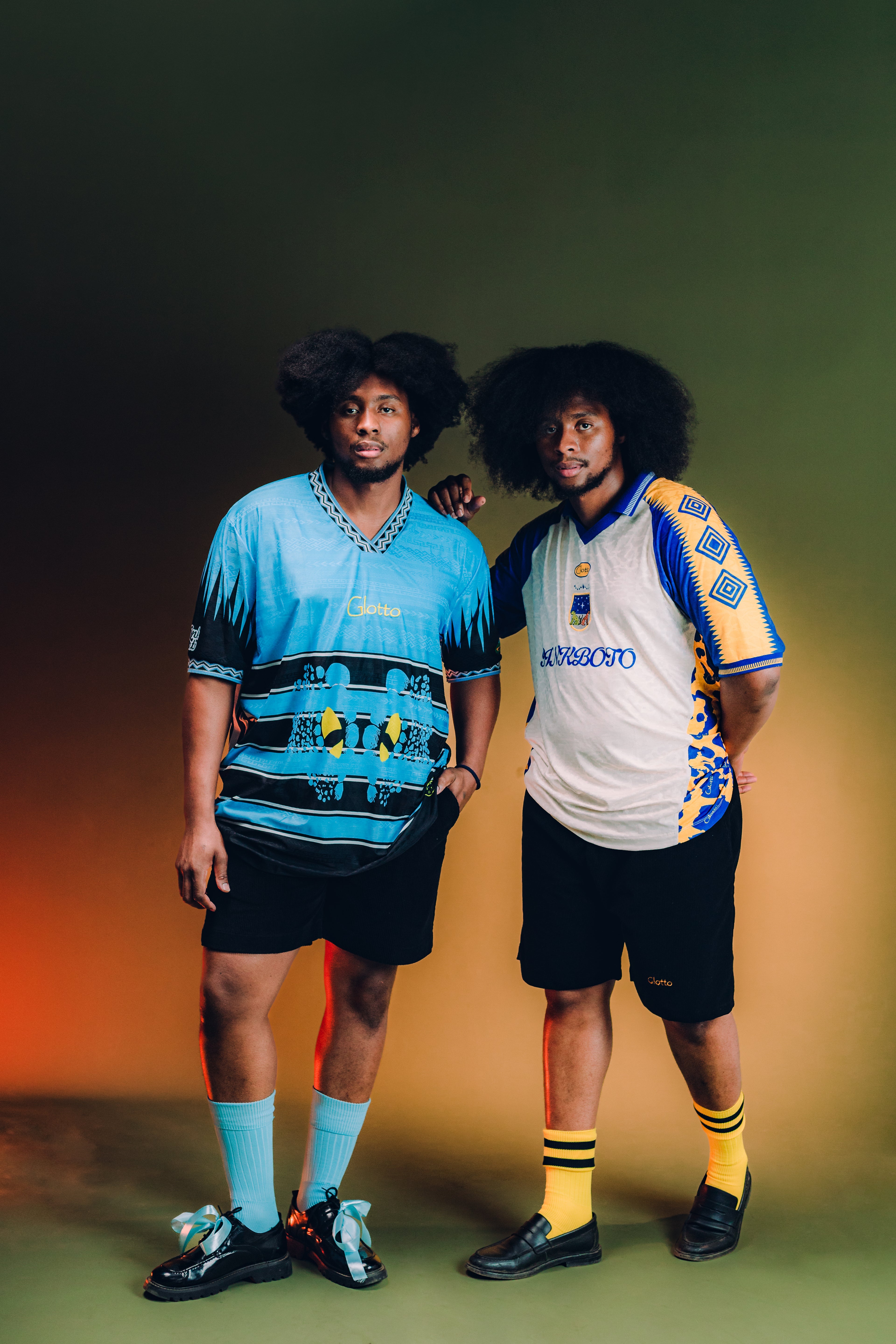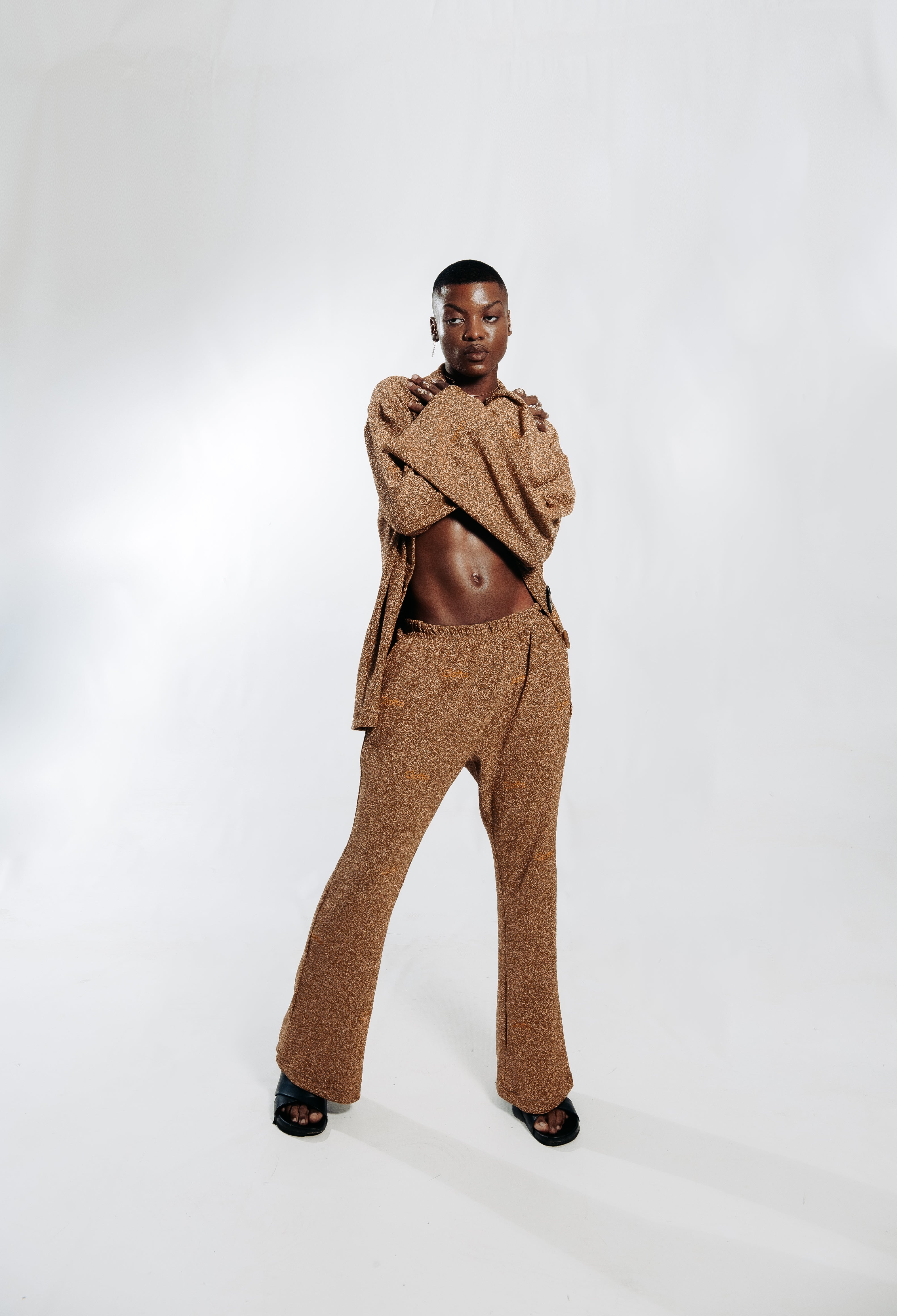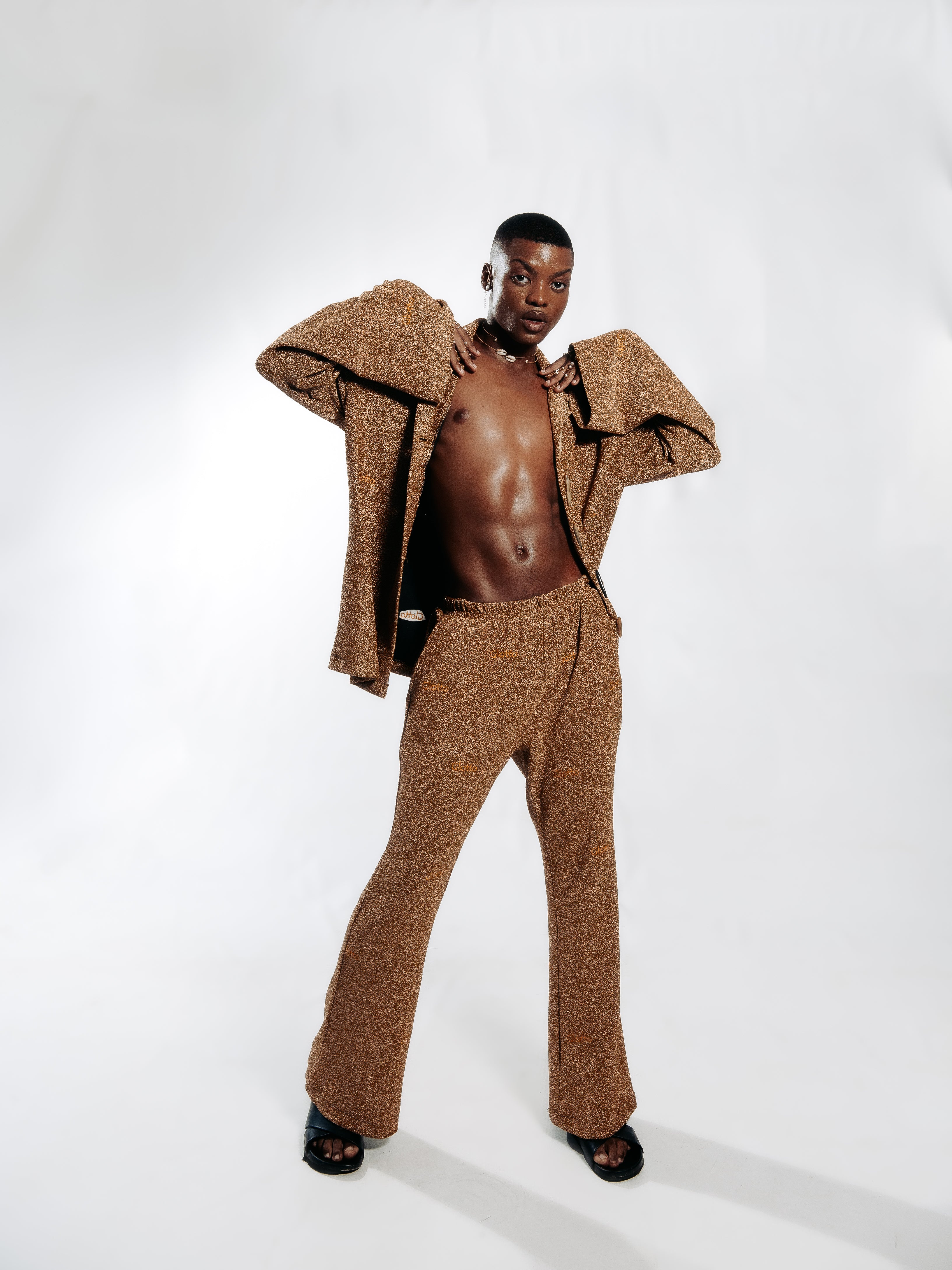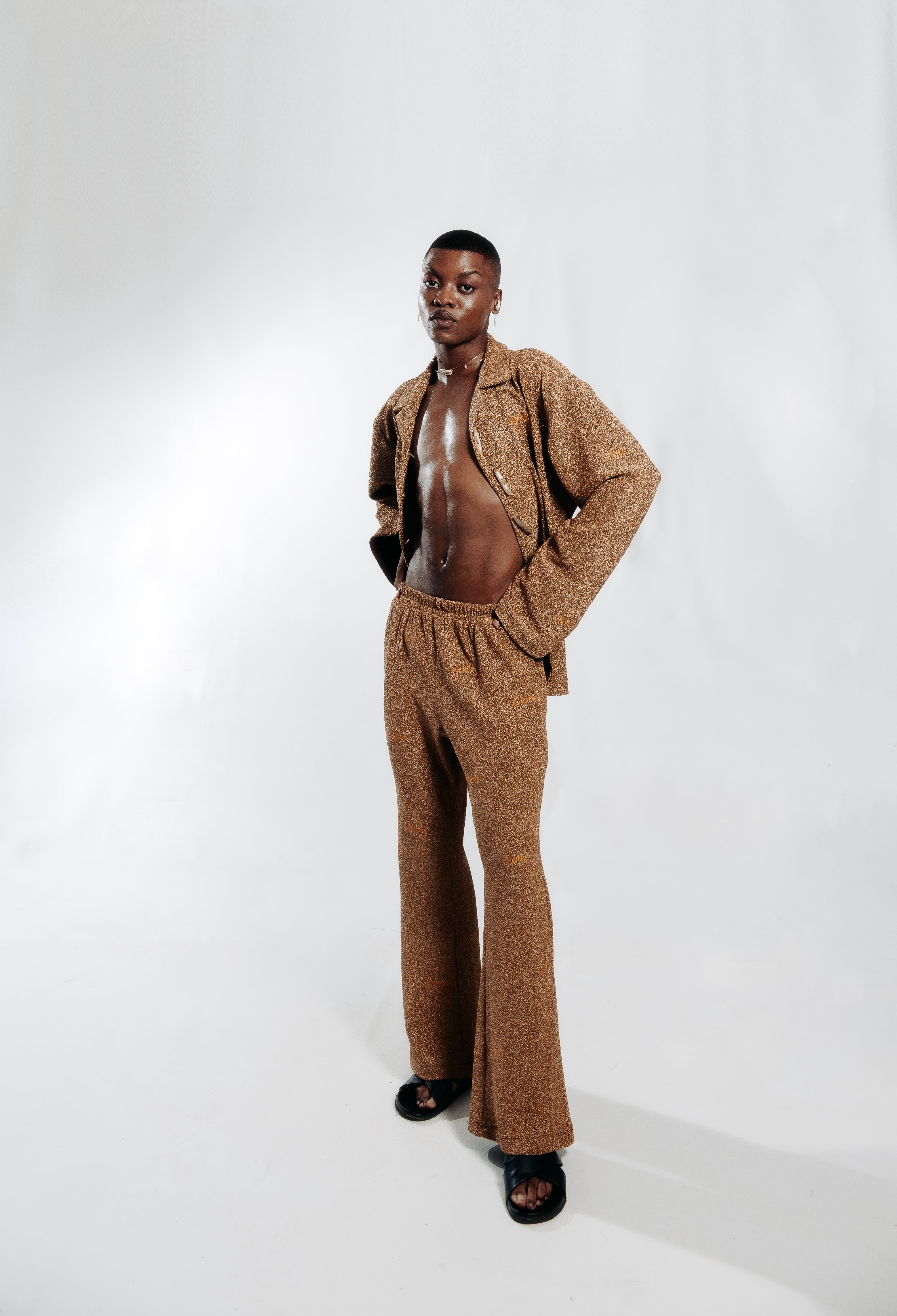 The Glotto SS/24 Moonlight Set is a runway showcased relaxed-fit, two-piece crafted from a soft, shimmer-textured textile embroidered throughout with the signature golden Glotto logo. Cut for movement and ease, the set features a lightweight collared top with wide sleeves and custom Glotto cow horn buttons, paired with flared trousers designed to drape comfortably across all genders.