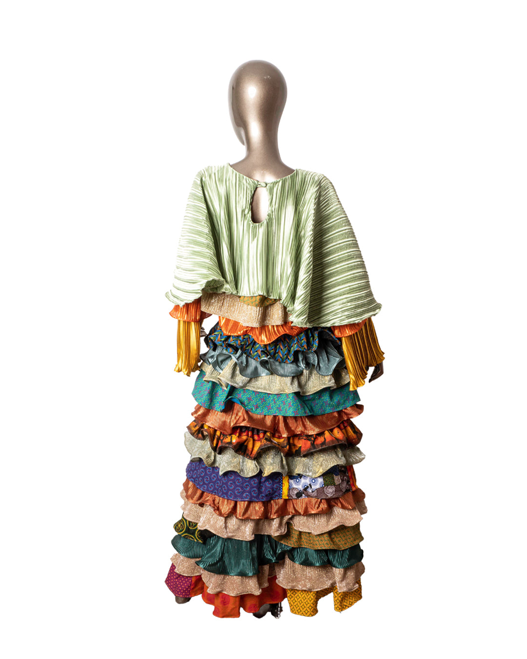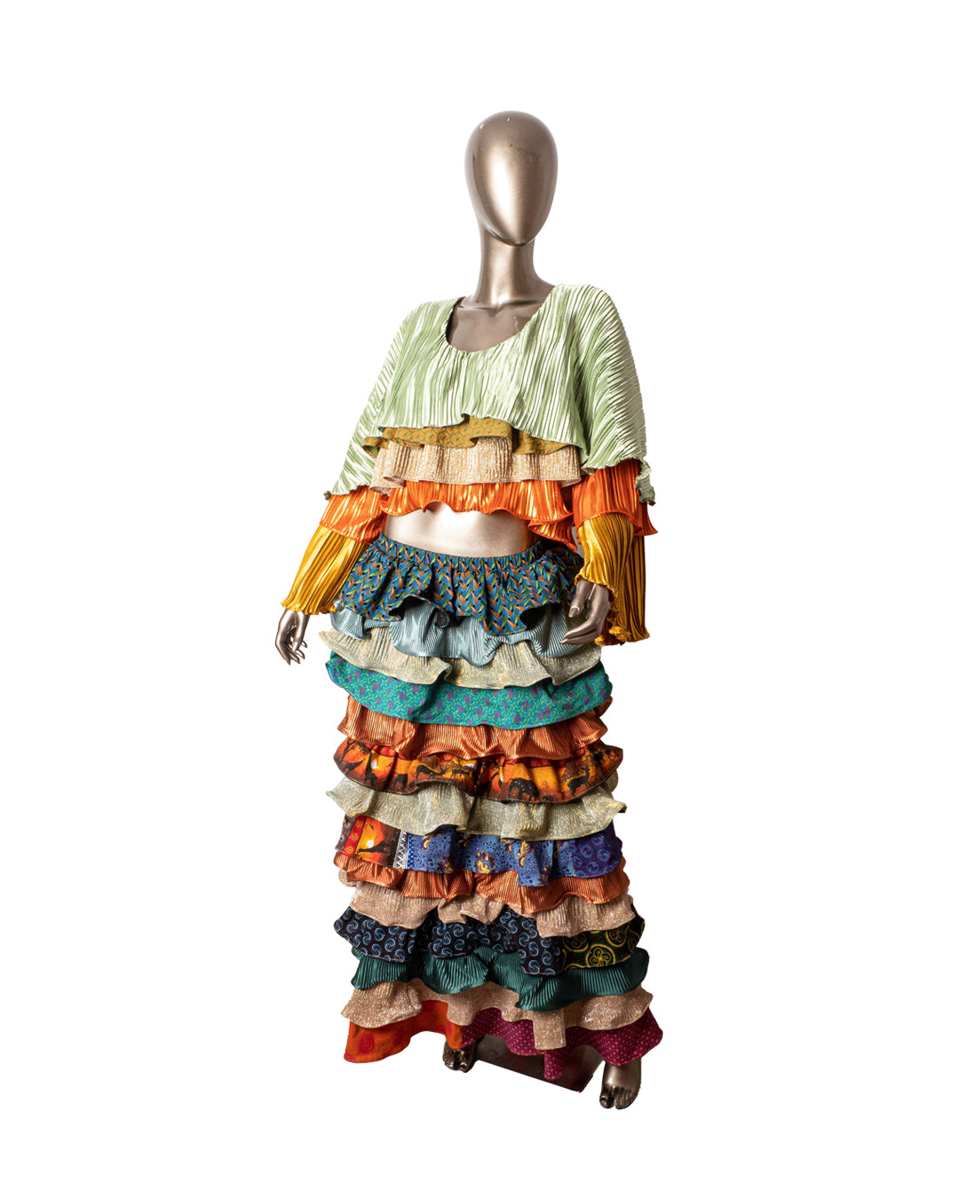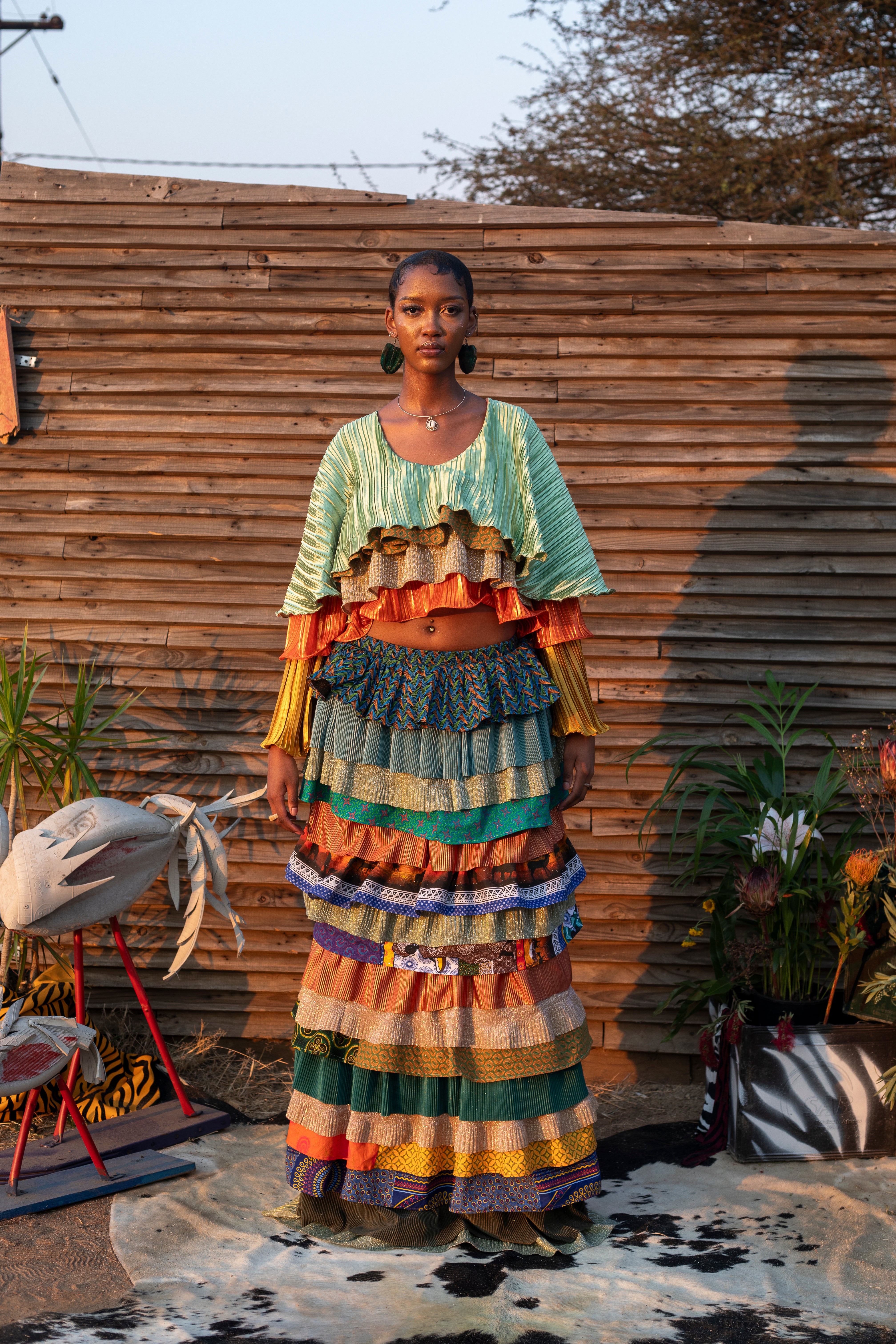 The Glotto Issey Dress returns in SS/26 as a modular two-piece: a layered pleated crop top and matching tiered maxi skirt. This edition fuses structured shimmer jersey, traditional “Leteise” (German print cotton), and metallic accordion pleats. The look captures Glotto’s pan-African maximalism, part runway drama, part everyday power, all handmade.