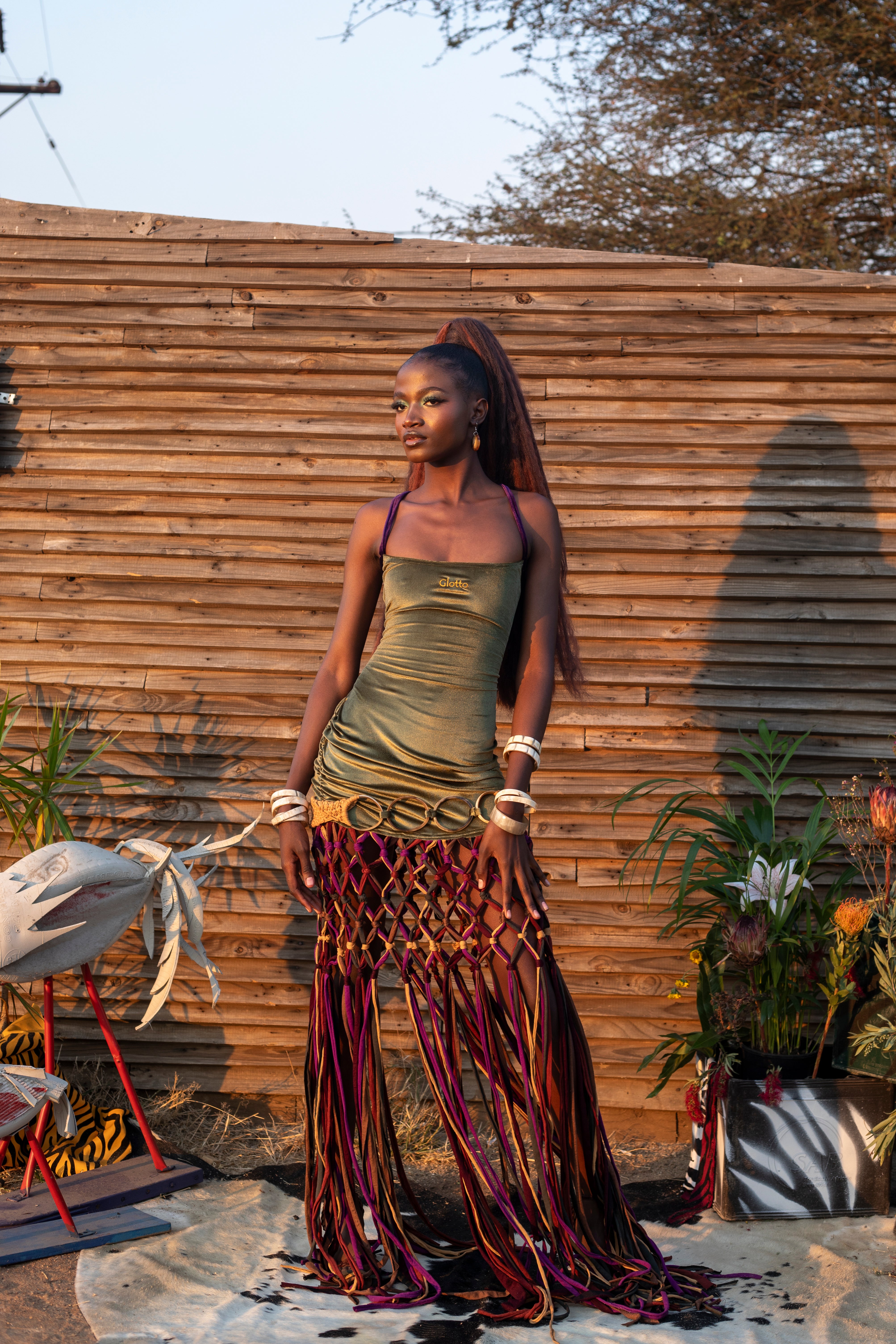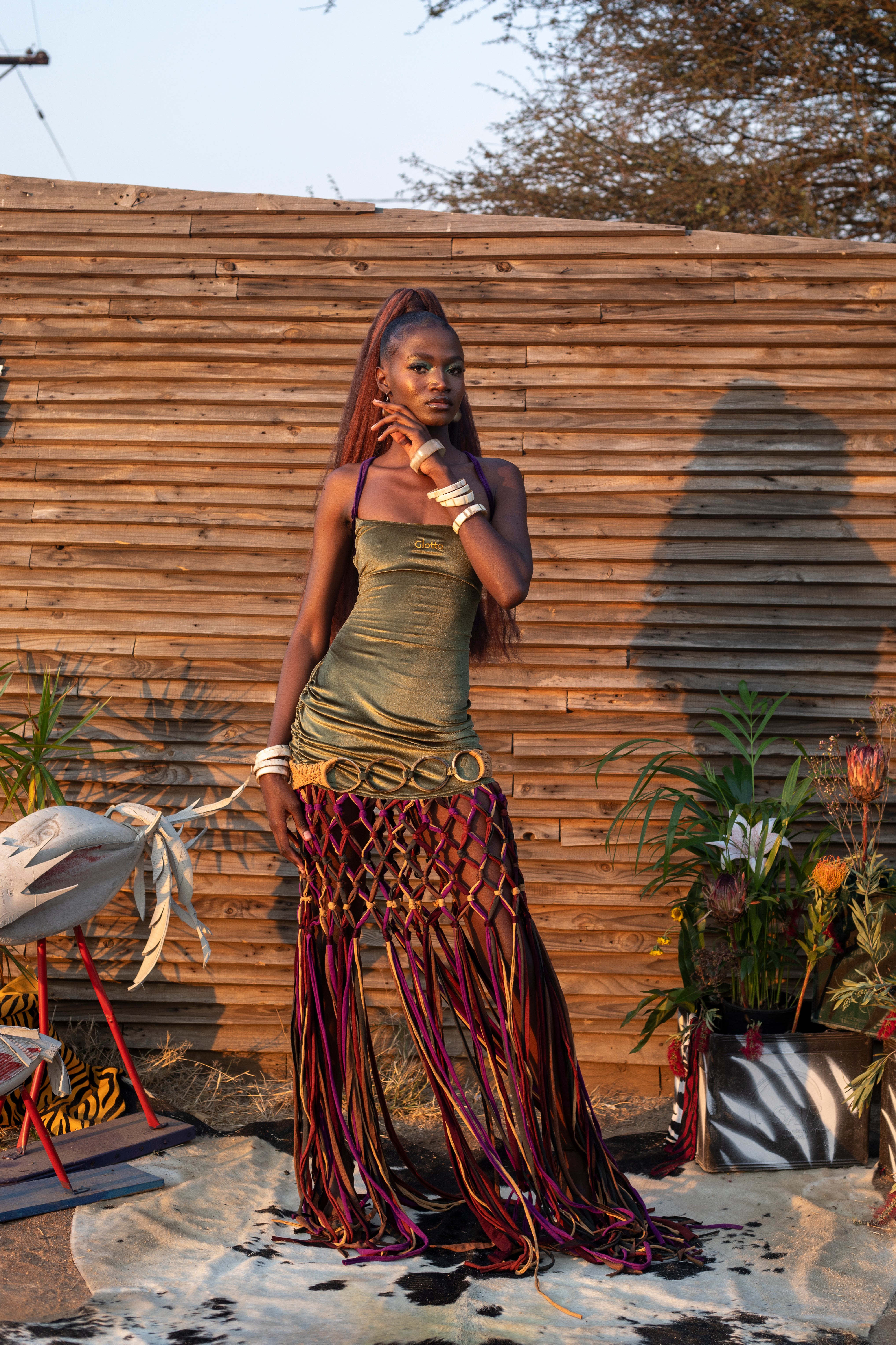 A dramatic reinvention of Glotto’s signature velvet silhouette, this SS/26 edition features cow-horn hoop links suspending a rich olive velvet draped mini dress. Intricately knotted macramé rope panels extend from the waist down, creating fringe-like movement that nods to ancient craft and ancestral lineages. Embroidered in gold at the center, this piece sits between sculpture and seduction.
