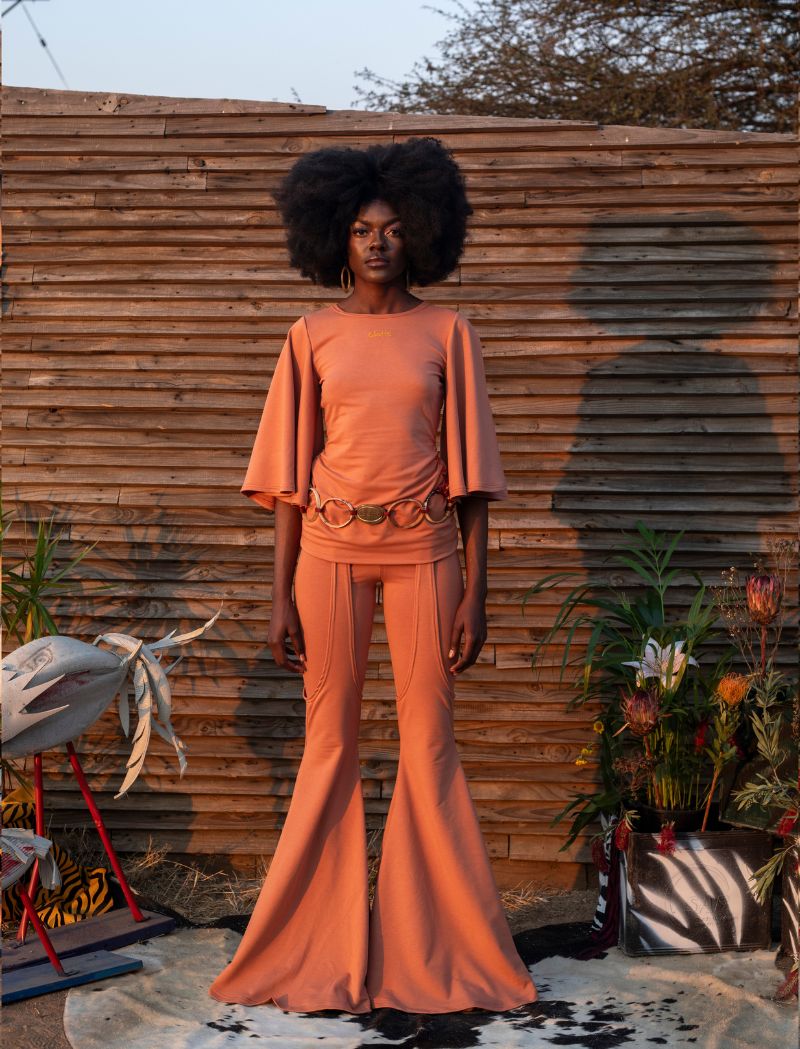 Rooted in function and form, this longline shirt dress with flared sleeves is constructed from cotton and paired with fitted matching leggings and matching saddles with with bell bottom design . Styled with a knotted macramé belt featuring Glotto’s signature engraved cow-horn buckle, the look honors contemporary desert nomads.